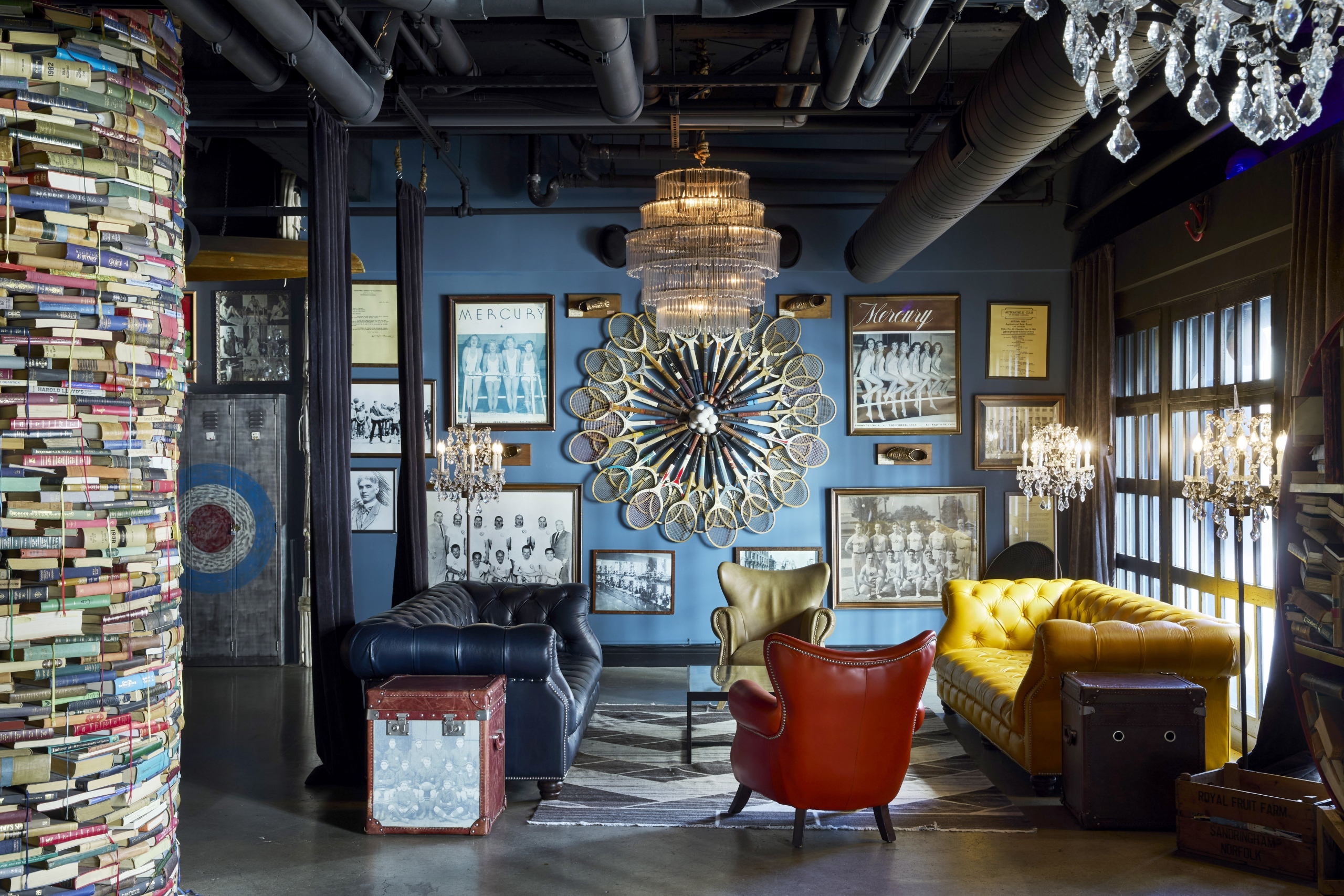 The Blue Room is a cozy gathering space featuring handcrafted crystal chandeliers, vintage sporting equipment, historic LAAC athletic photos, and antique lockers.